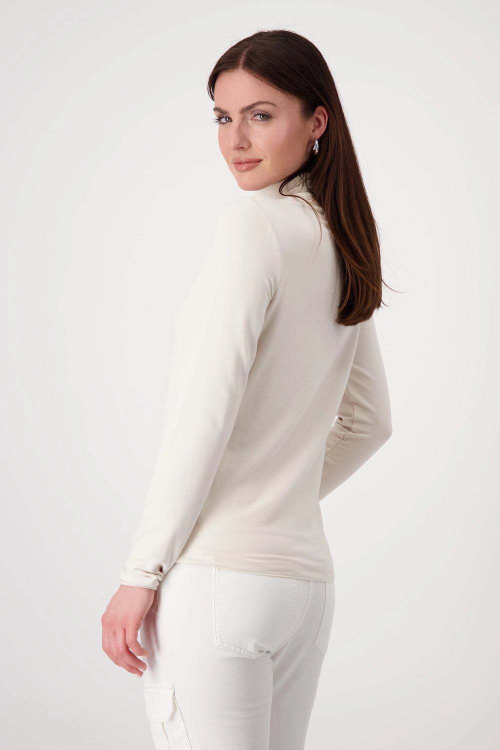 Refined elegance meets everyday comfort with the Monari Stand-Up Collar T-Shirt in Sandshell. Crafted from a sustainable EcoVero viscose blend with a mix of 45% viscose, 45% modal, and 10% elastane, this top offers a soft, breathable feel with a hint of stretch for a perfect fit.