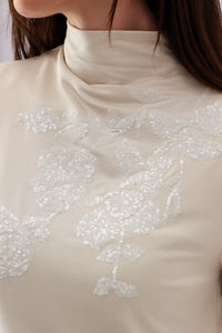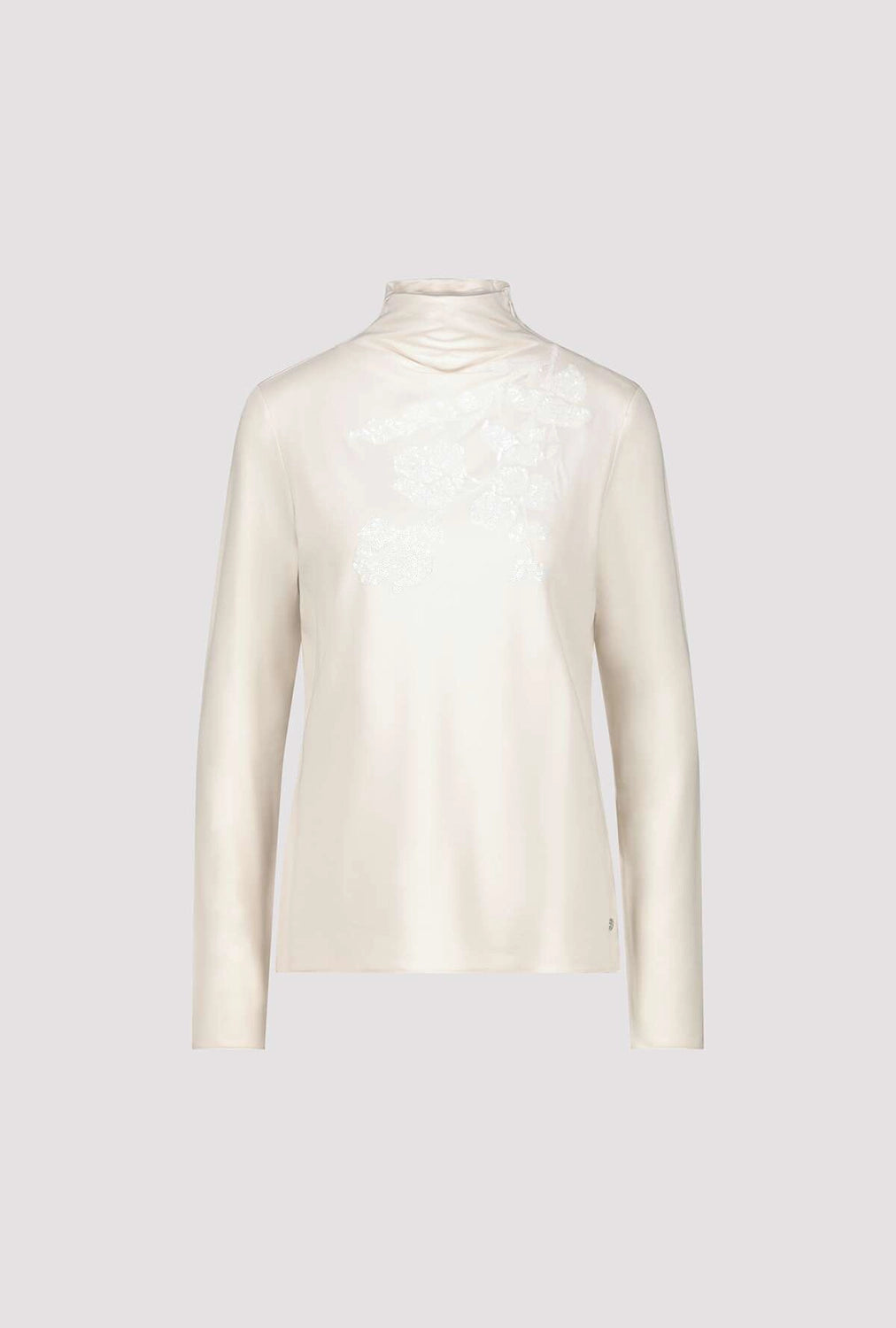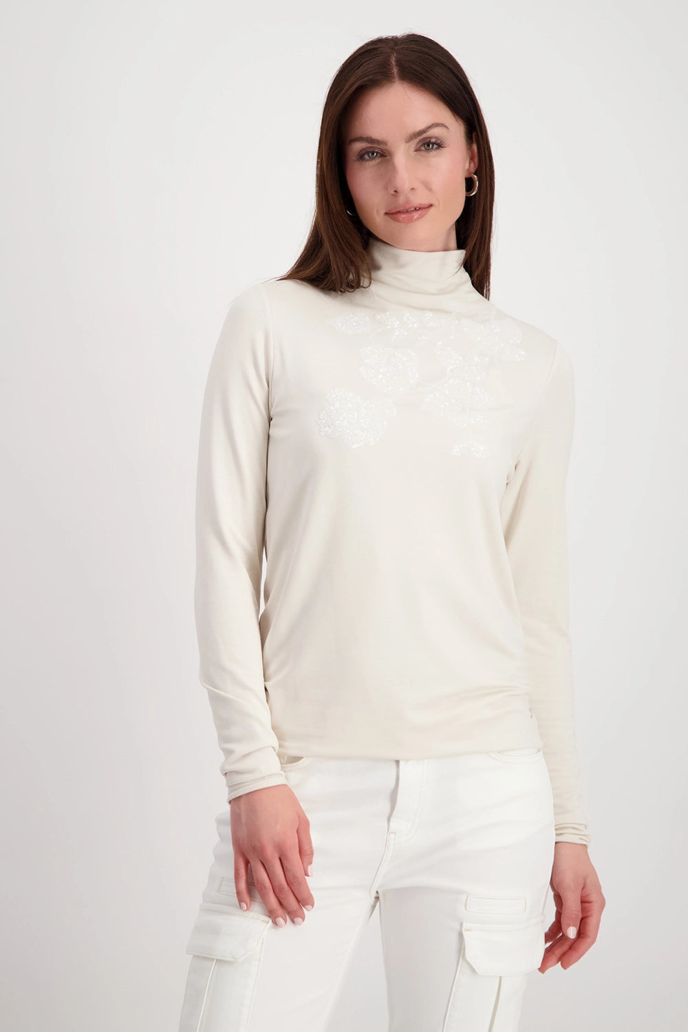 Designed with a stand-up collar, long sleeves, and a regular fit, this t-shirt is both timeless and contemporary. A tone-on-tone sequinned flower adds a subtle yet sophisticated detail, elevating this everyday essential.