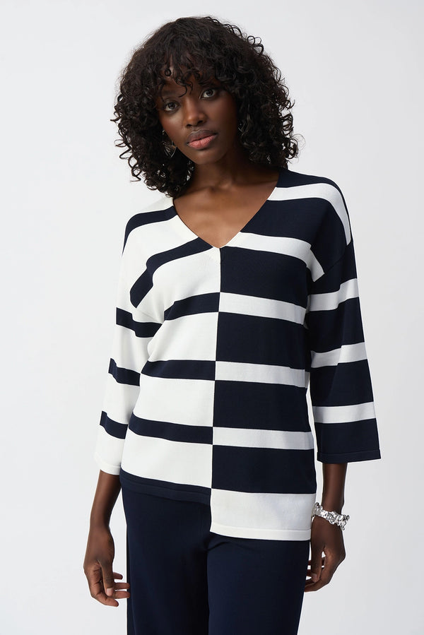 Joseph Ribkoff | Striped Sweater Knit V-Neck Pullover - Midnight Blue/Vanilla