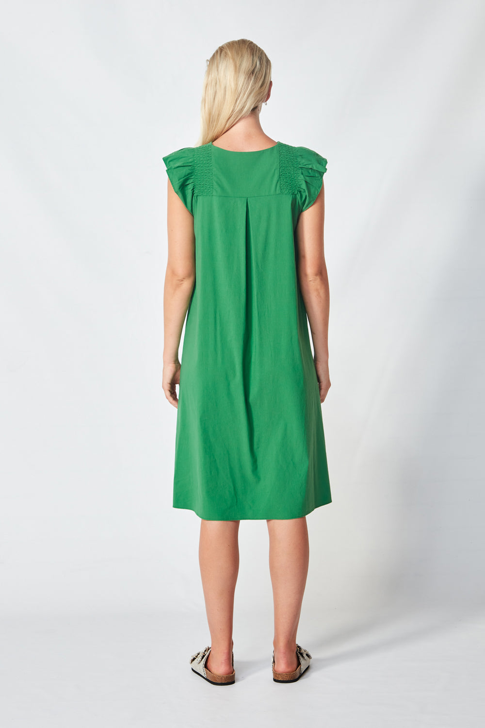 The Verge Acrobat Polly Dress in Apple is a V-neck shift dress crafted from Verge's exclusive European stretch cotton Acrobat fabric. It features paneling through the body with concealed side pockets, shirred details on the front and back of the shoulders for a ruffle cap sleeve, and a back yoke with an inverted pleat. The dress falls to the knee, offering both comfort and elegance.