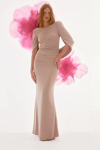 Capture the attention of everyone in the room in this shimmering full-length dress. Cut in a fitted trumpet silhouette, this dazzling dress is adorned with attractive pleating at the bodice, and draped back sleeves for a hint of drama. A demure boat neckline and a discrete back zipper closure complete this visual stunner. Part of the Signature collection.