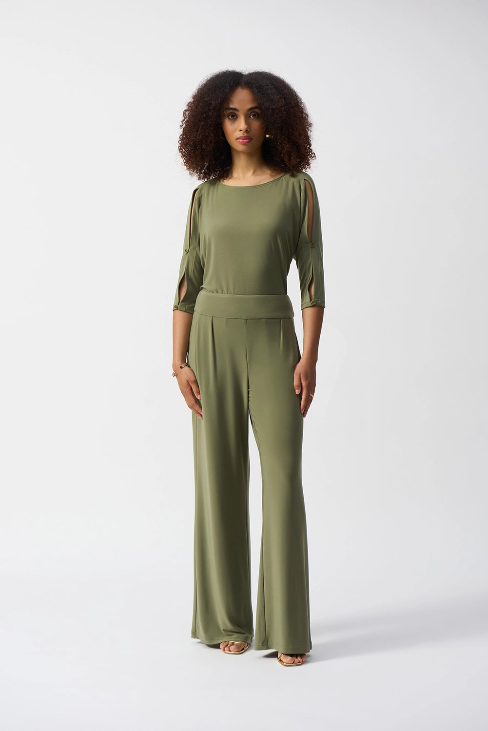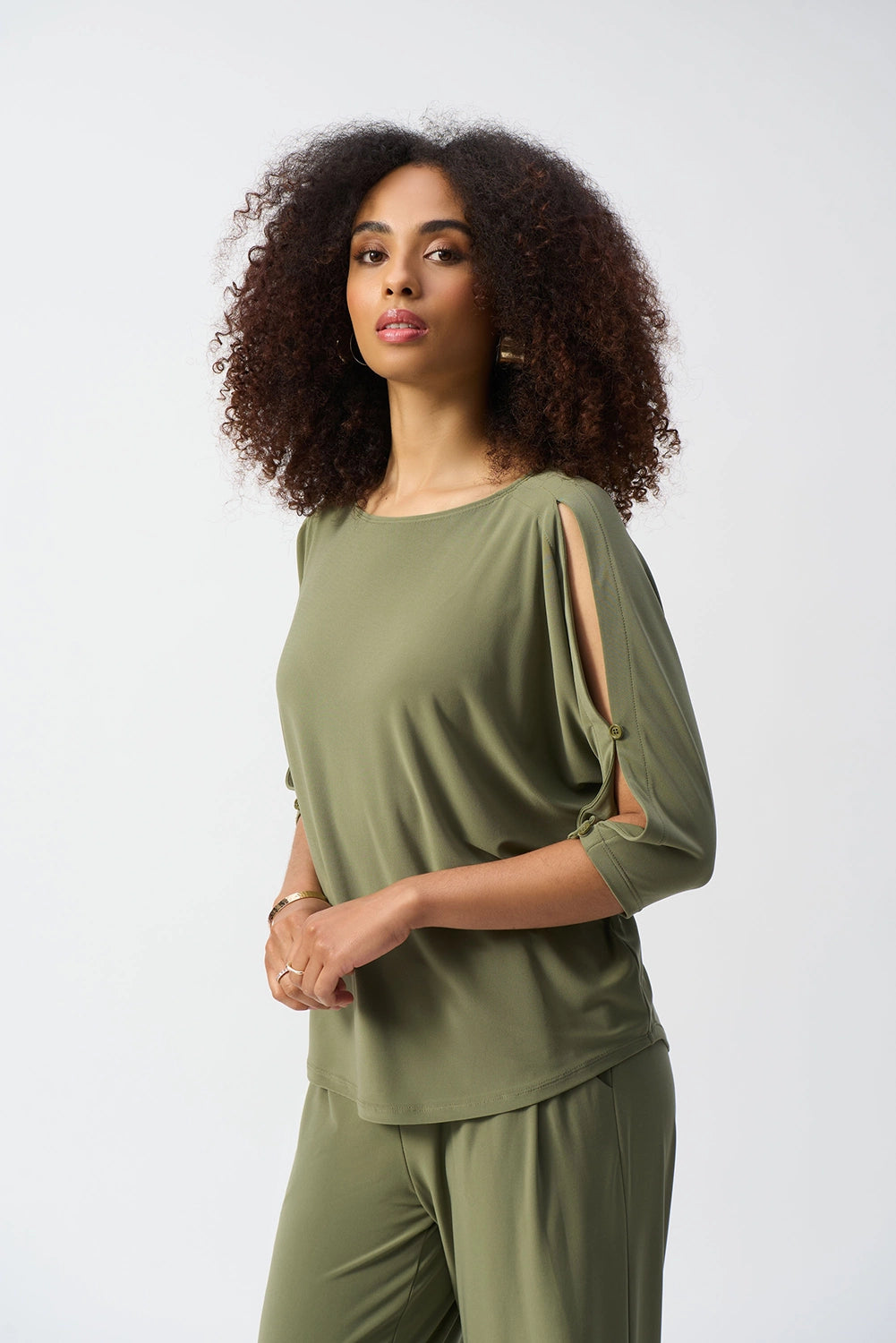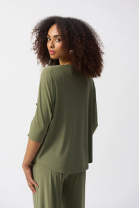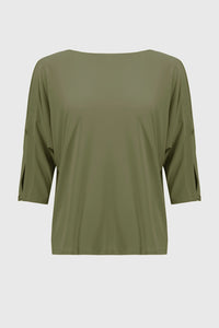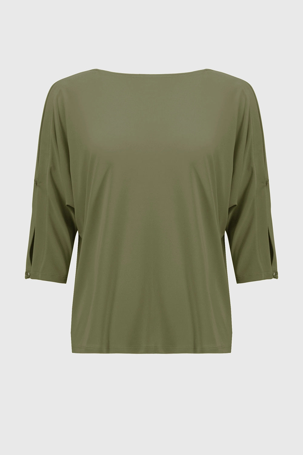 Indulge in the casual chic allure of this silky knit top. The sleek boat neck and three-quarter dolman sleeves with slit and buttons exude timeless elegance. The bold boxy silhouette adds character and lends a polished feel to this contemporary piece.