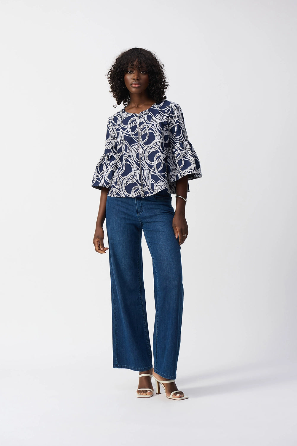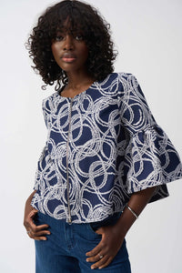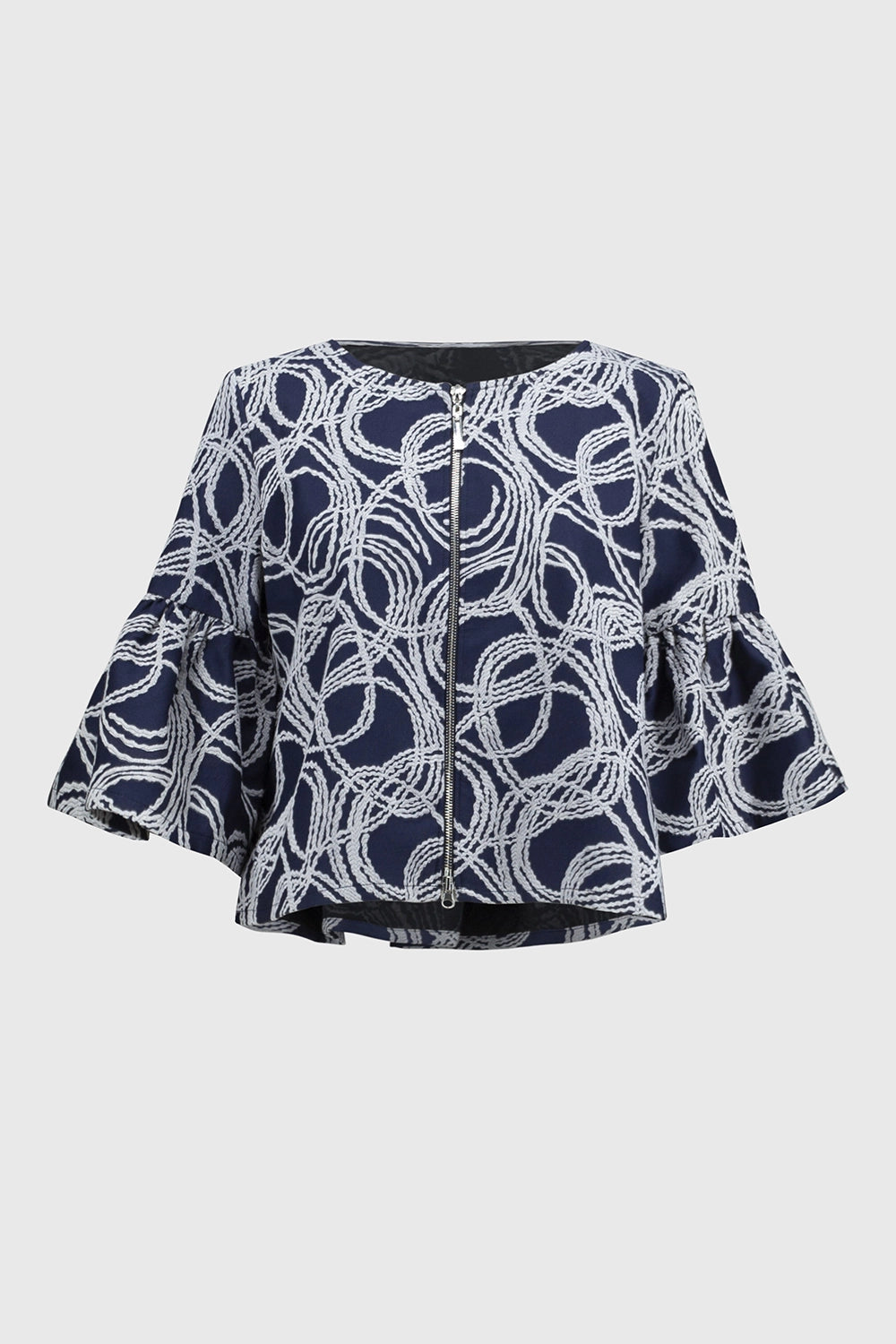 This jacquard jacket captures the very best of modern sophistication. The design’s bold abstract print exudes a unique flair that elevates any ensemble. The scoop neckline and three-quarter ruffled sleeves complement the piece’s sleek trapeze silhouette. The garment also showcases a beautiful two-way front closure zipper, back yoke and shirred back to perfect the jacket’s refined look.