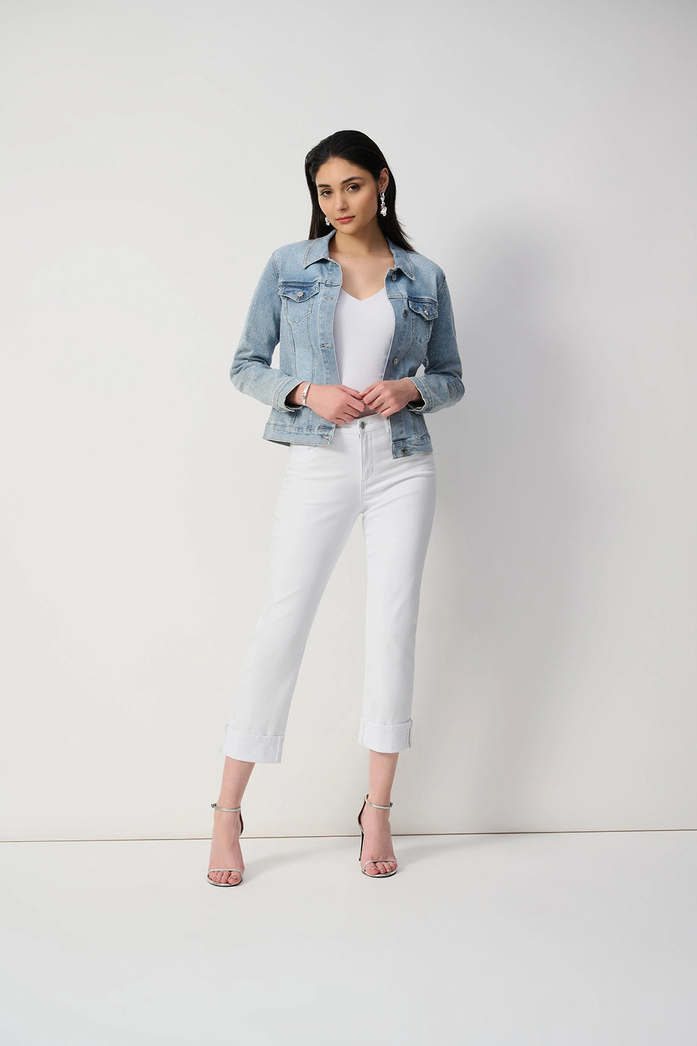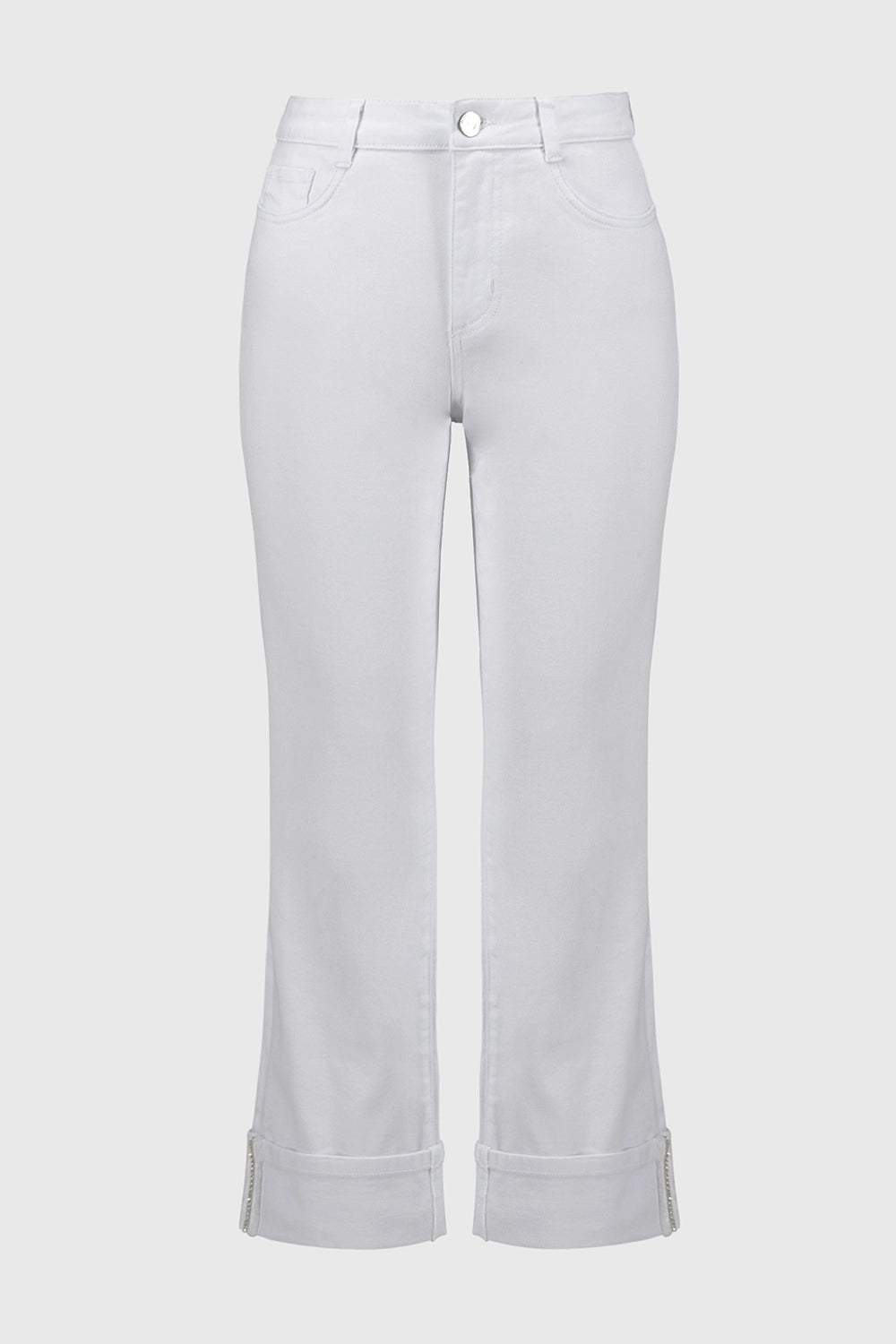 Embellished by a turned bottom hem with a shimmering rhinestone trim, these slim fit cropped denim pants will elevate any everyday outfit. It's a 10/10 for this classic five-pocket style, crafted from the highest quality stretch denim fabric.
