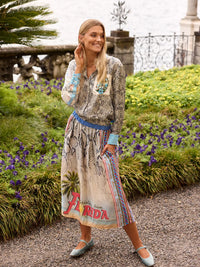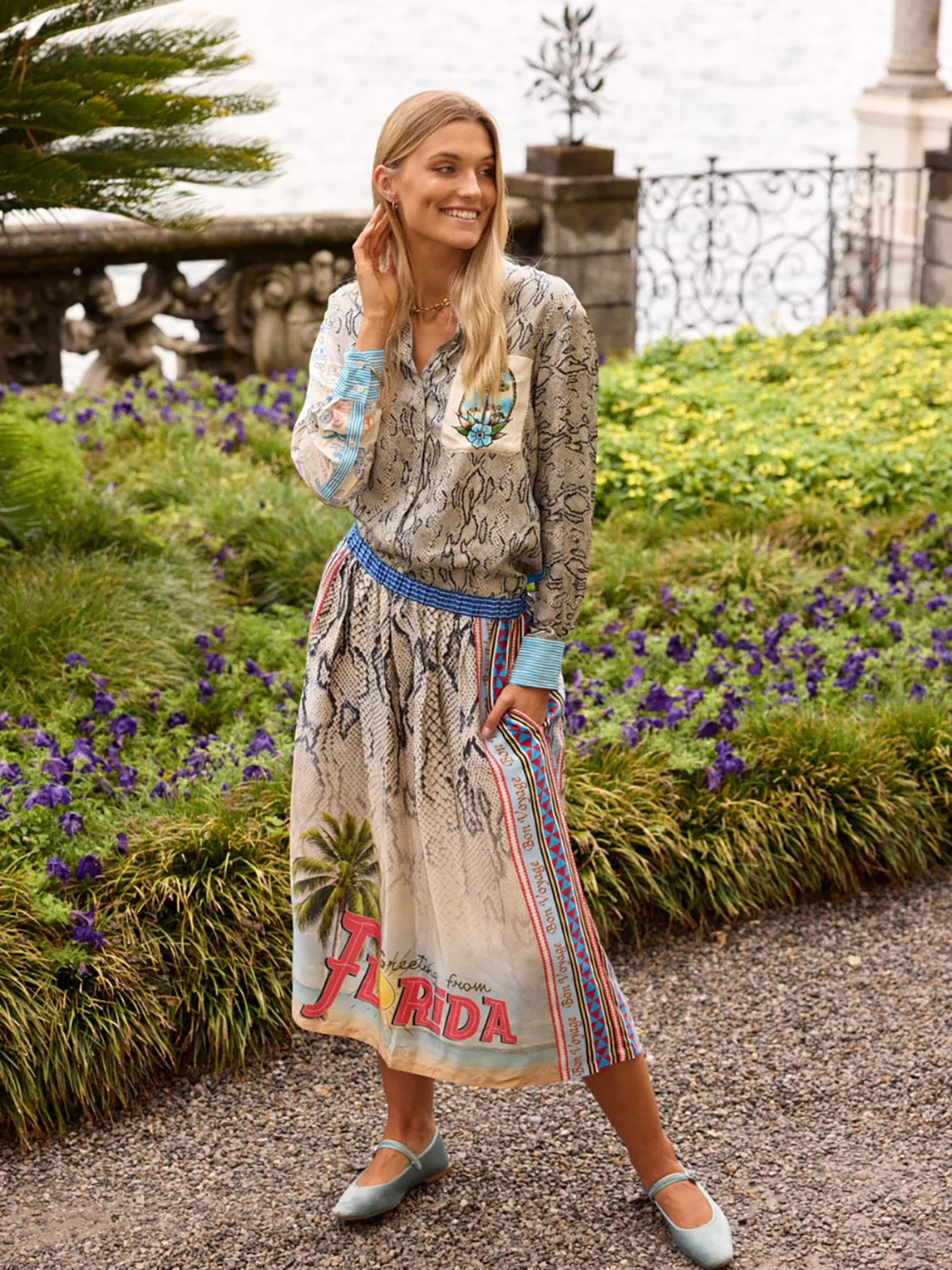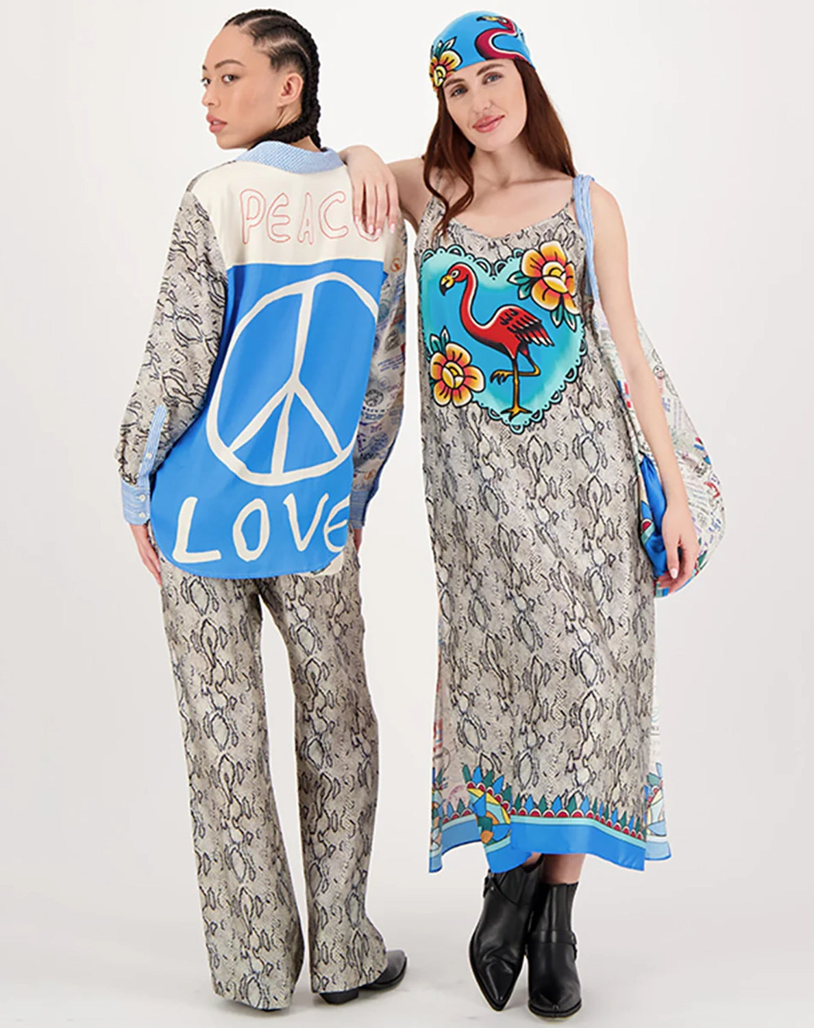 Long sleeve button down shirt with collar and cuffs in our Snake Charmer print. Front of the shirt and one sleeve are in a gray snakeskin print. The other sleeve has vintage stamps in muted colors. The collar and cuffs are in a blue small geometric print. Back reads “PEACE” across the top. The rest of the back is blue with a large peace sign in white and the word “LOVE’ underneath. Pair with our matching Bailey track pants for a complete vintage inspired look.