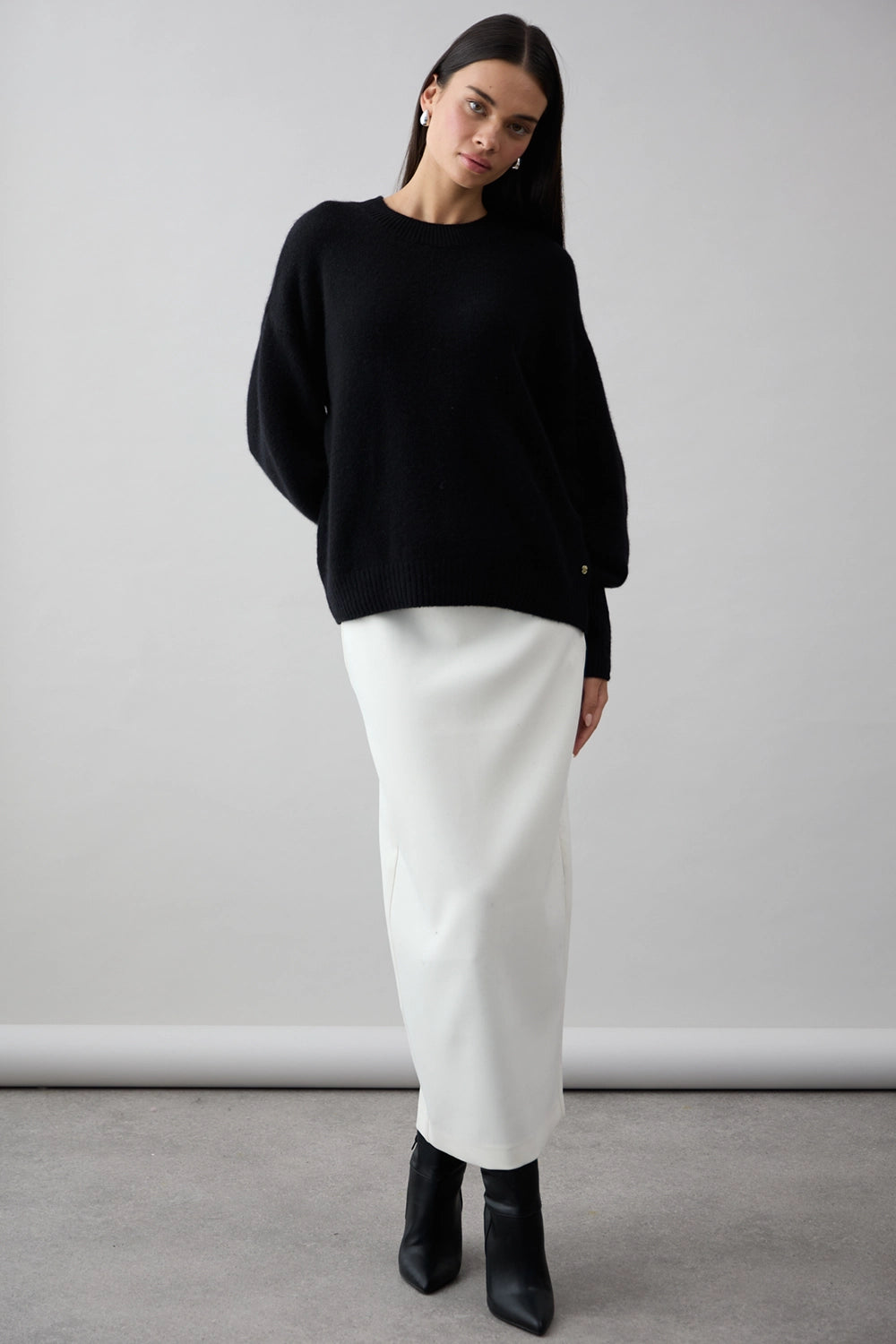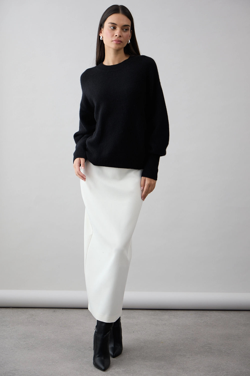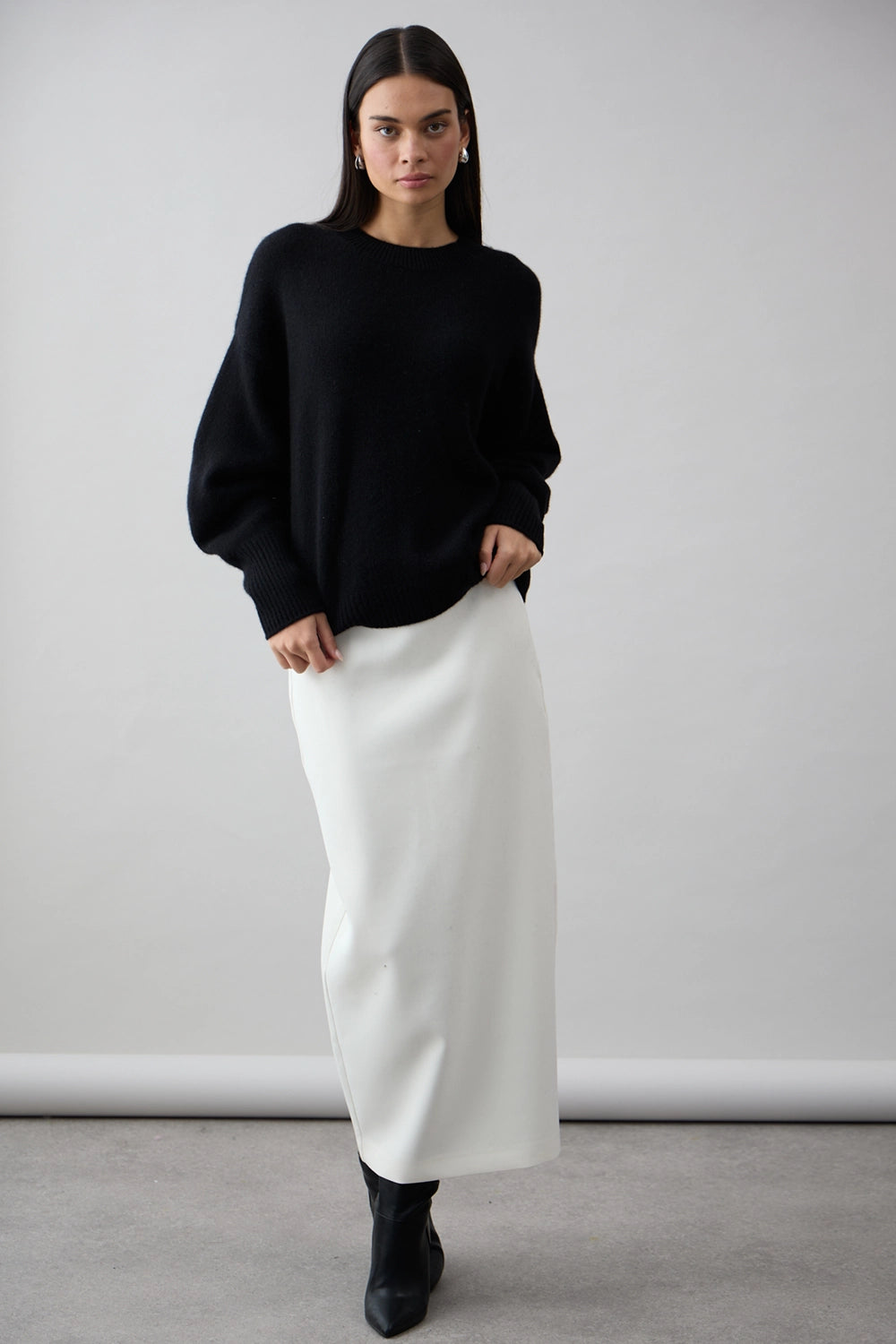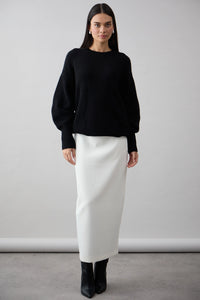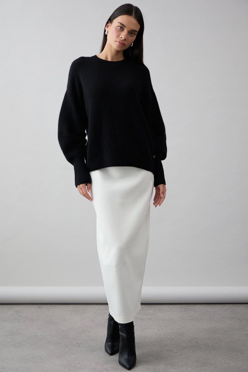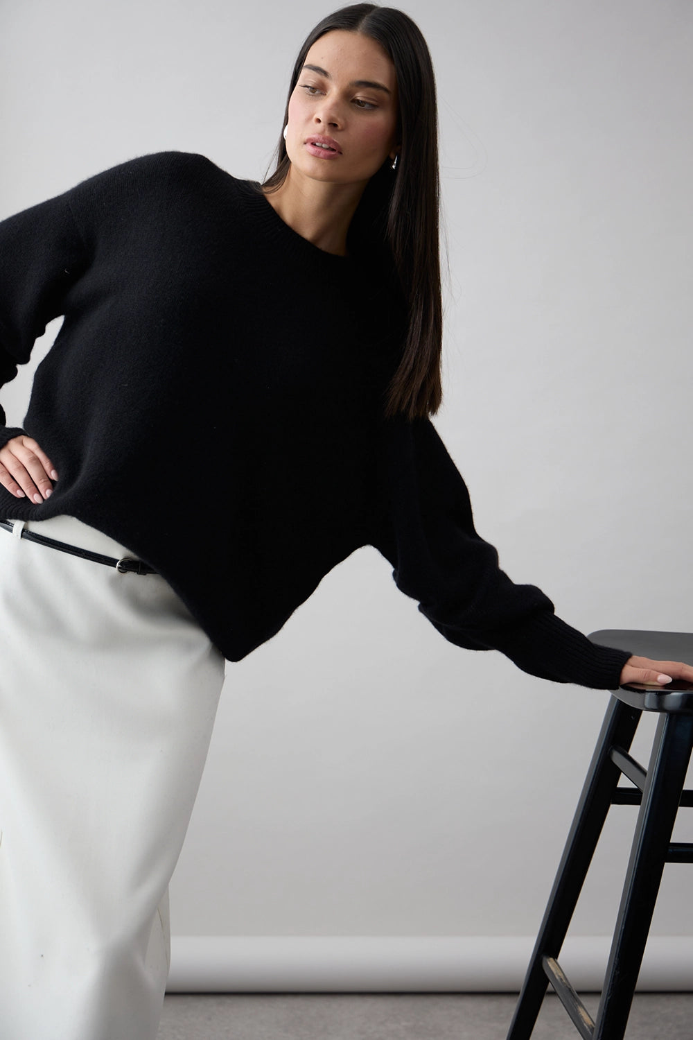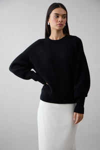 The Noelle Crew in Jet Black by Mia Fratino is a refined essential, crafted from 100% Mongolian cashmere for a luxurious, feather-soft feel. Designed with a relaxed silhouette and classic crew neckline, this timeless piece pairs elegance with effortless comfort. Subtle ribbed detailing at the cuffs, hem, and collar completes the look—perfect for both everyday layering and elevated styling.