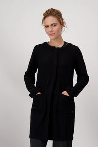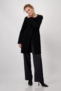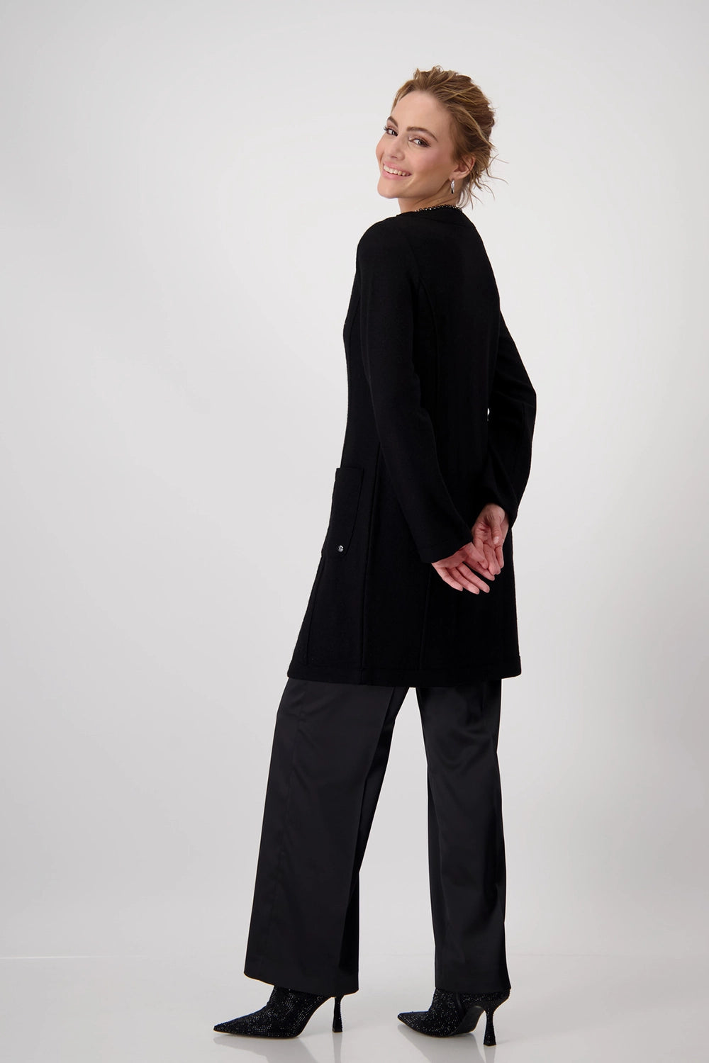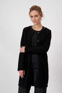 Elevate your wardrobe with the Monari Cardigan featuring a removable embellished insert. Crafted from 100% wool, this cardigan offers both warmth and elegance. The detachable cotton trim, adorned with embellishments, allows you to transition from a classic daytime look to an evening-ready ensemble effortlessly. Designed with a regular fit, round neckline, concealed snap fasteners, and practical patch pockets, this piece combines functionality with refined style.