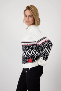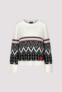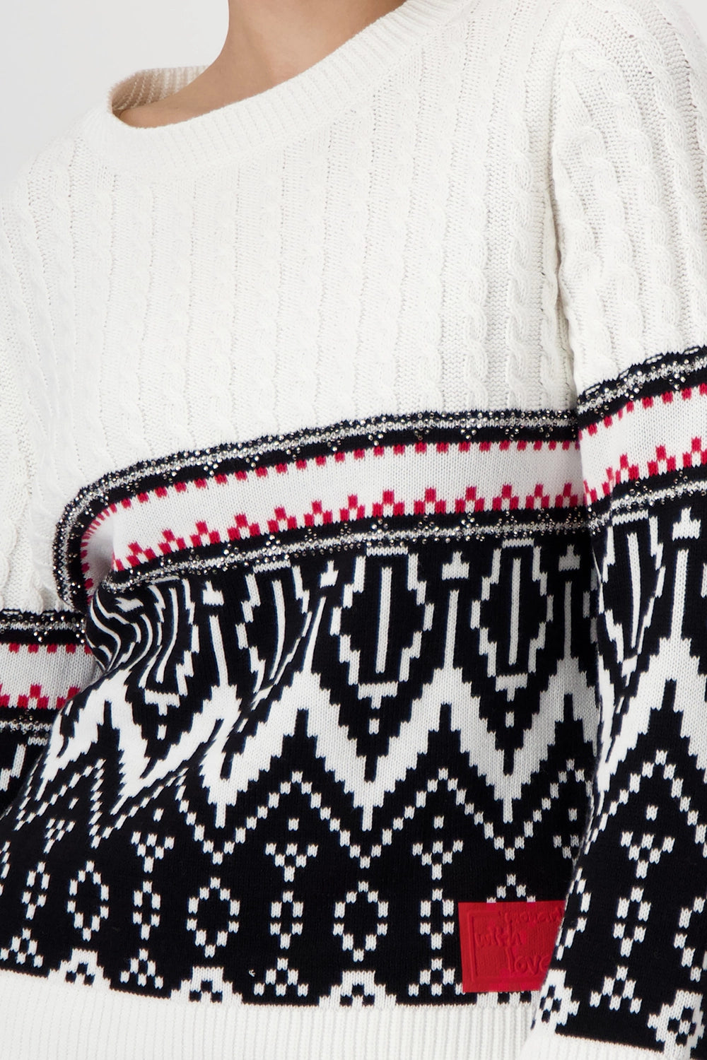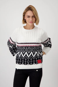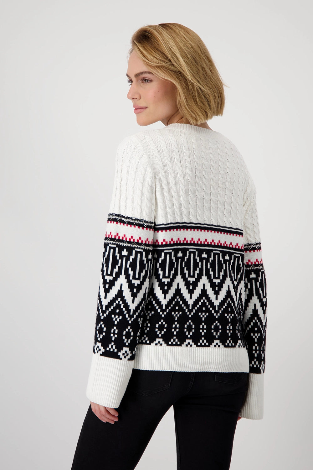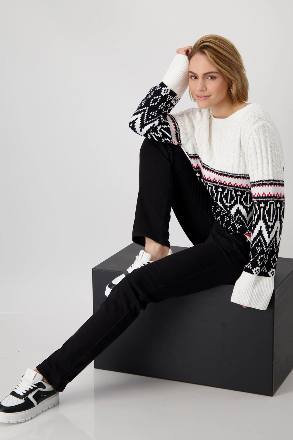 Elevate your knitwear collection with the Monari Knitted Jumper in Off White. Crafted from 100% cotton, this jumper features a classic jacquard pattern enhanced by sparkling rhinestone embellishments, adding a touch of glamour to your everyday ensemble. The regular fit, round neckline, and long sleeves with ribbed cuffs and hem ensure both comfort and style.