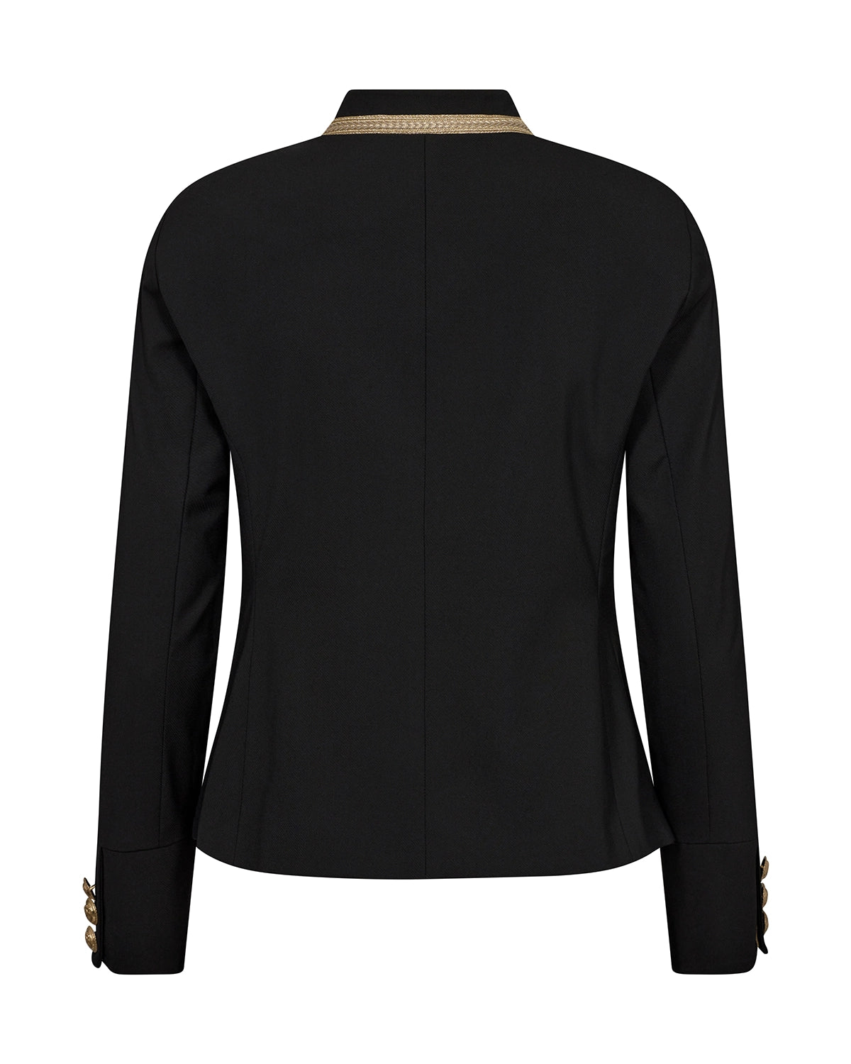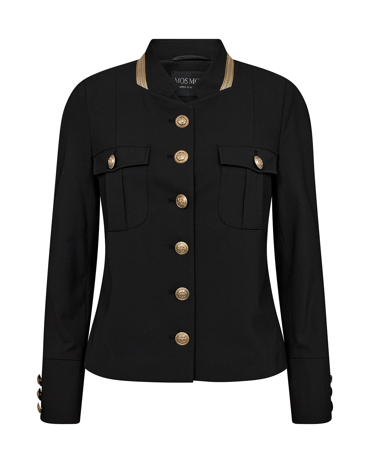 Elevate your wardrobe with the MOS MOSH Selby Piet Jacket in classic black. Crafted from a premium blend of 48% LENZING™ ECOVERO™ viscose, 45% recycled polyester, 4% elastane, and 3% polyester, this tailored jacket offers both sustainability and style. The design features gold-embossed buttons, chest pockets, and subtle gold detailing at the collar, adding a touch of elegance to its regular fit silhouette. Perfect for both professional and casual settings, this jacket is a versatile addition to any wardrobe.