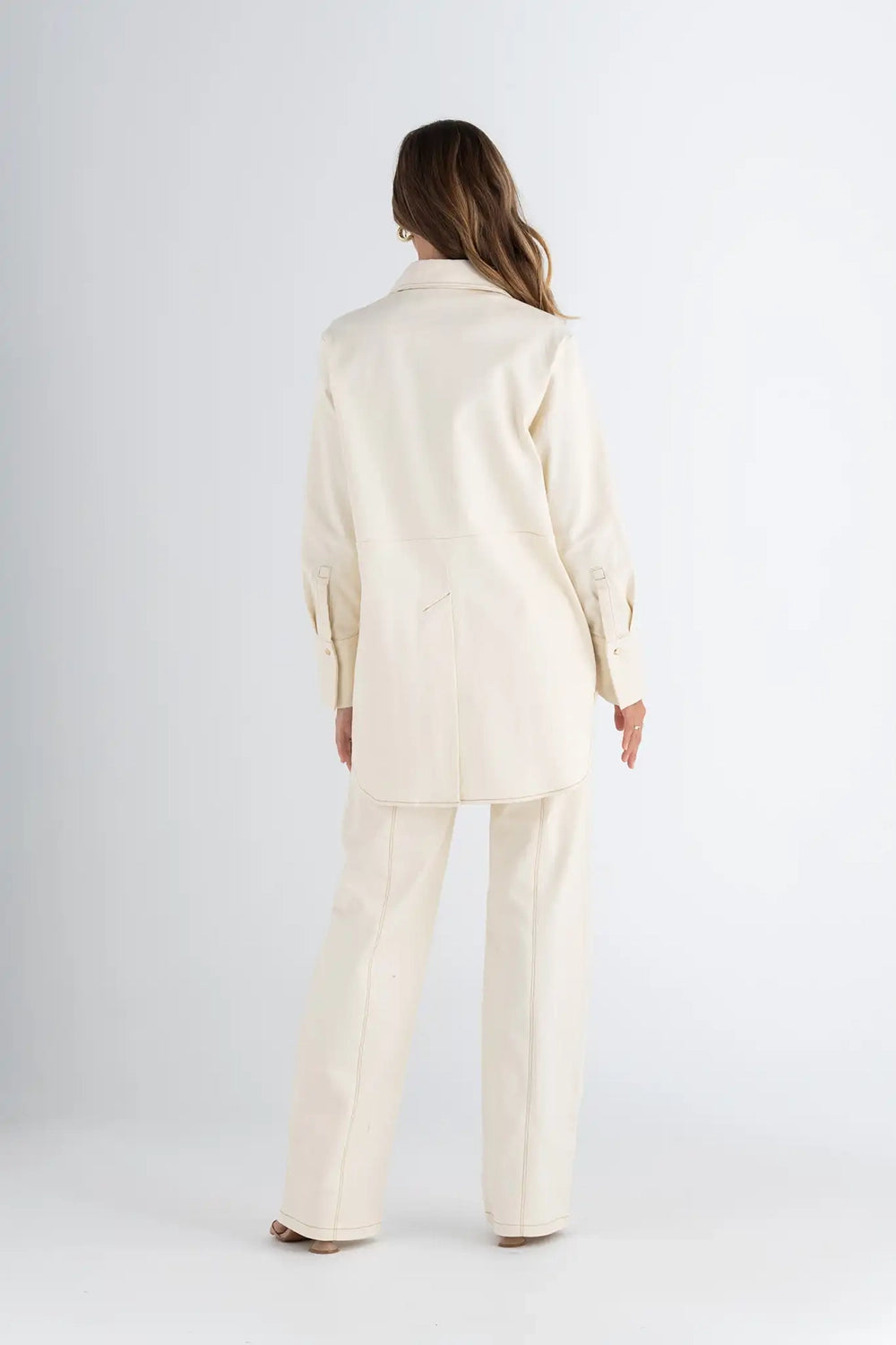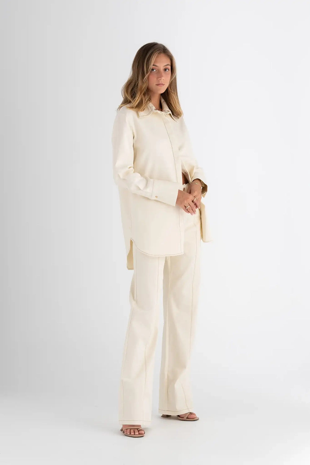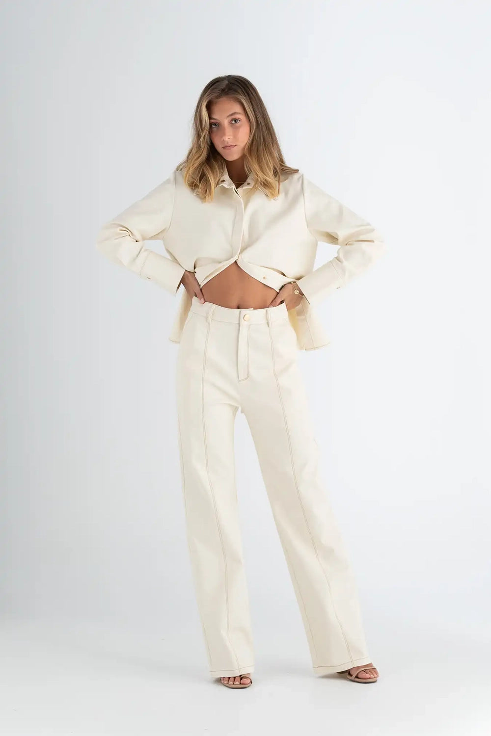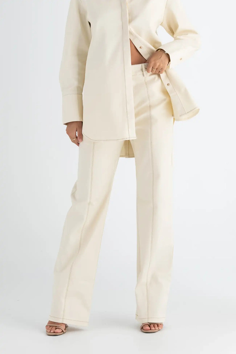 The Abundance Pant by PASDUCHAS is made from a stretch twill. Sitting firmly at the high waist with traditional waistband and belt loop details. This straight-leg silhouette features a singular pin-tuck running from waist to hem, enhanced by contrast stitching throughout.