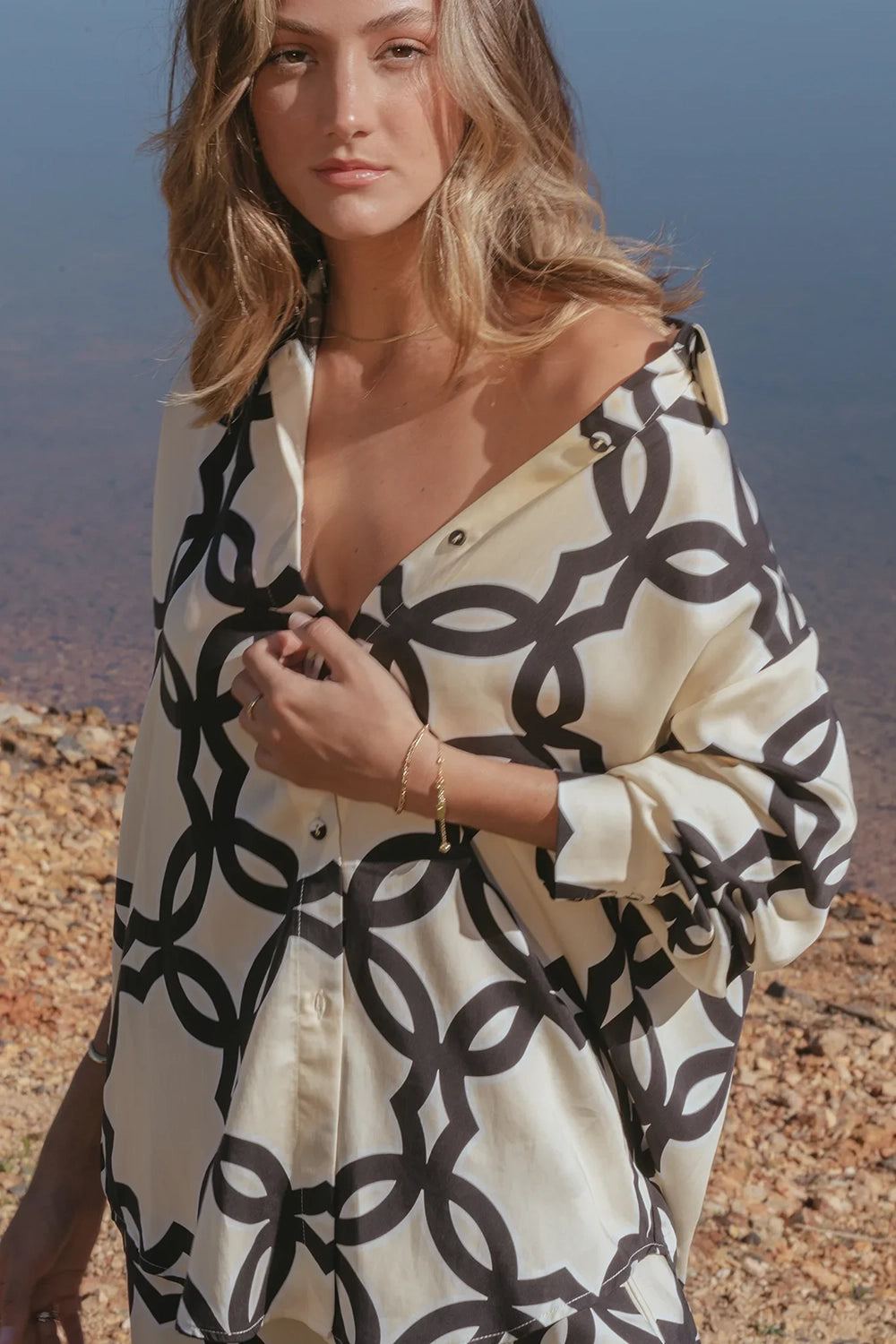 The Covert Shirt by PASDUCHAS is crafted from soft-touch Tencel and features an exclusive oversized interlocking quatrefoil print. A relaxed cut with a traditional collar and dropped sleeves adds ease of fit. The style is finished with a classic button and buttonhole closure through the centre front and at the cuffs.