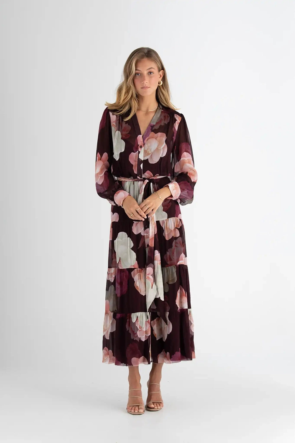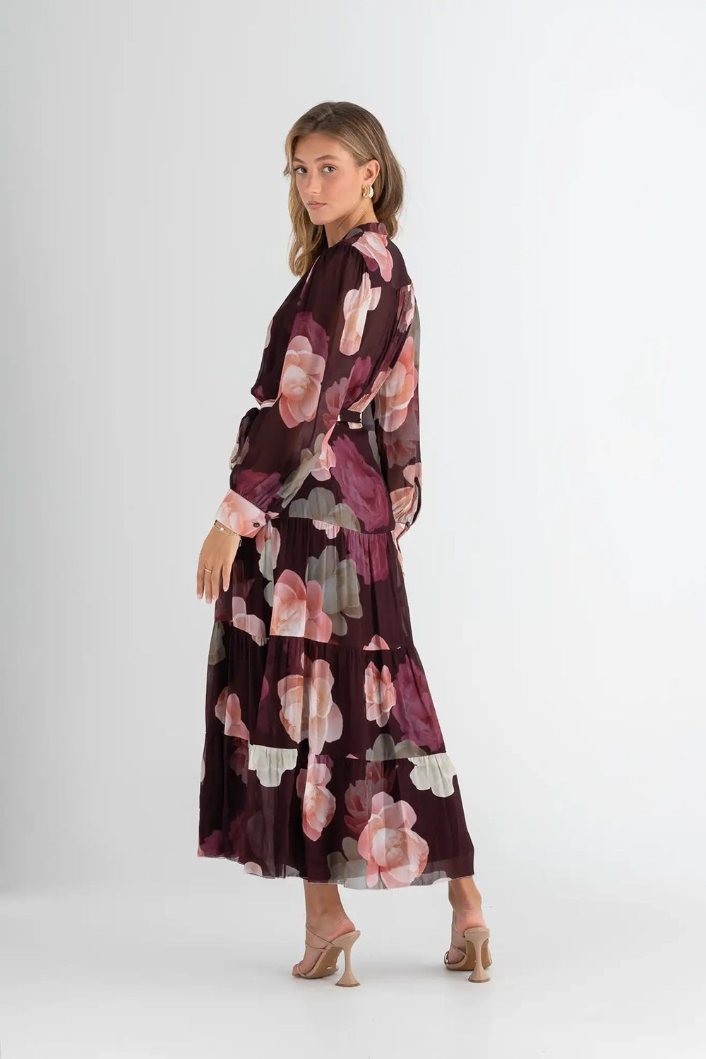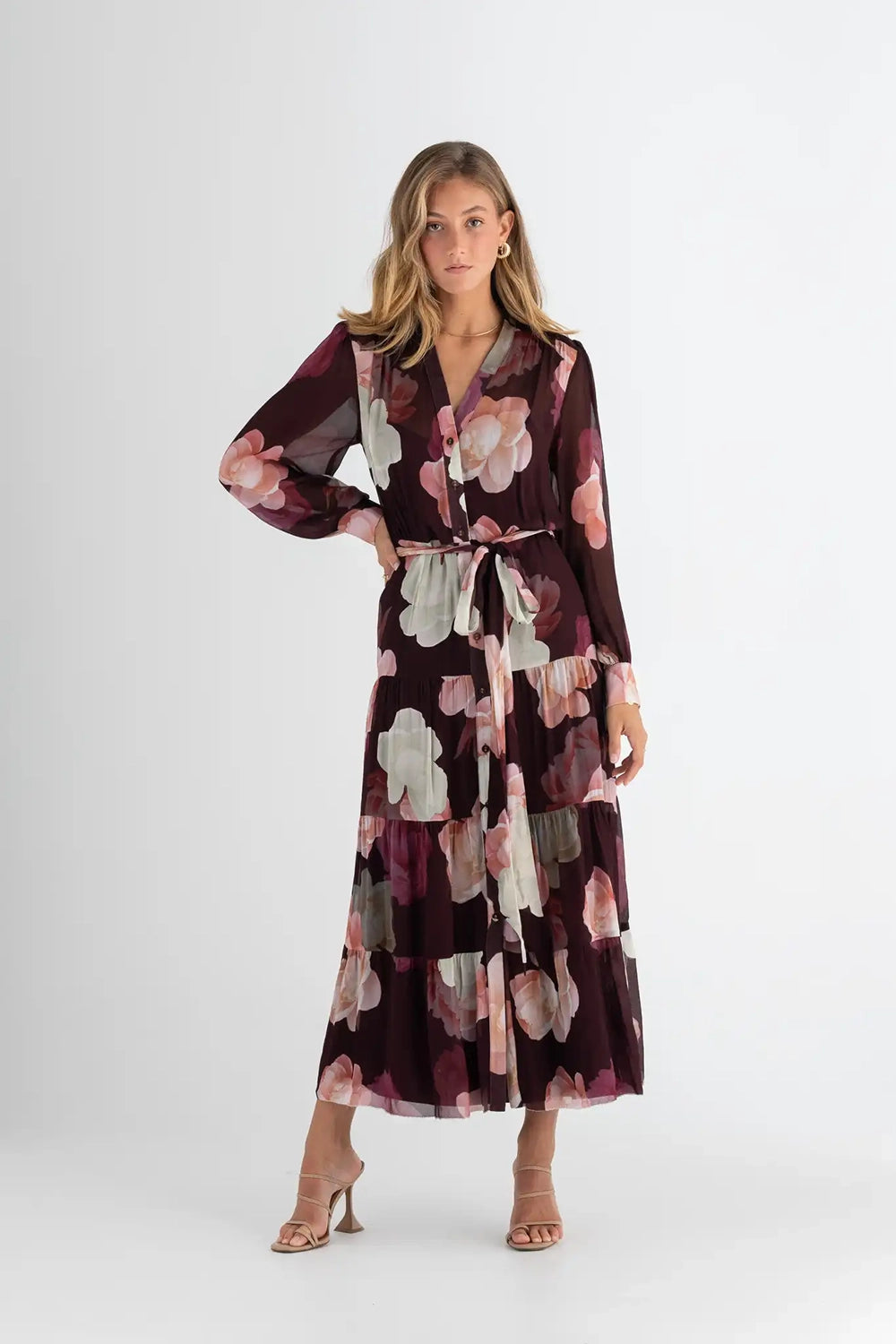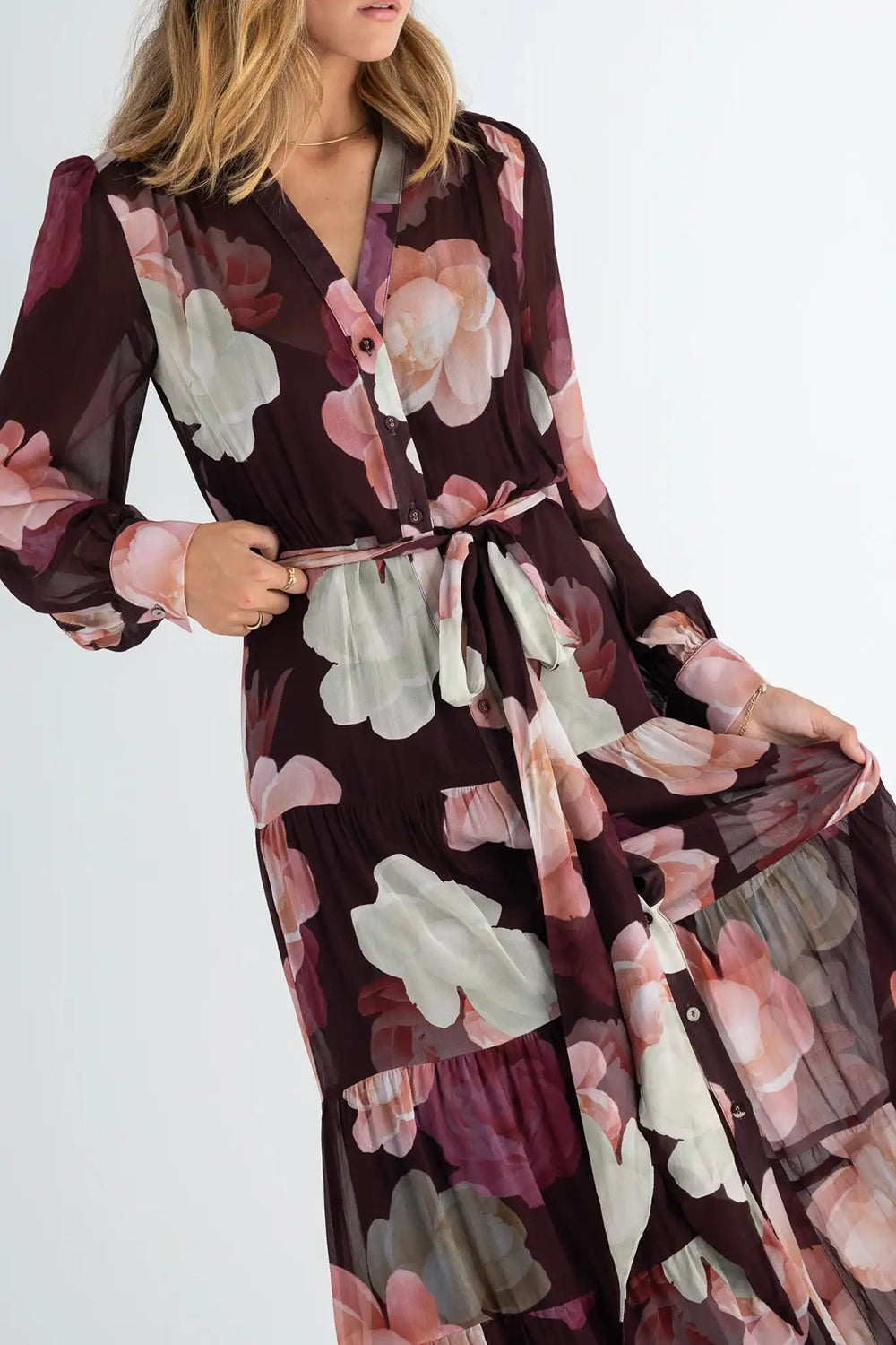 The Memoirs Shirt Midi by PASDUCHAS is crafted from soft viscose chiffon, featuring an exclusive floral print. This classic button-through, tiered shirt midi dress is complete with self-covered buttons along the centre front. It cinches at the waist with a self-tie belt, and the full-length cuffed sleeves bring balance to the look. Fully lined through the body, offering comfortable coverage.