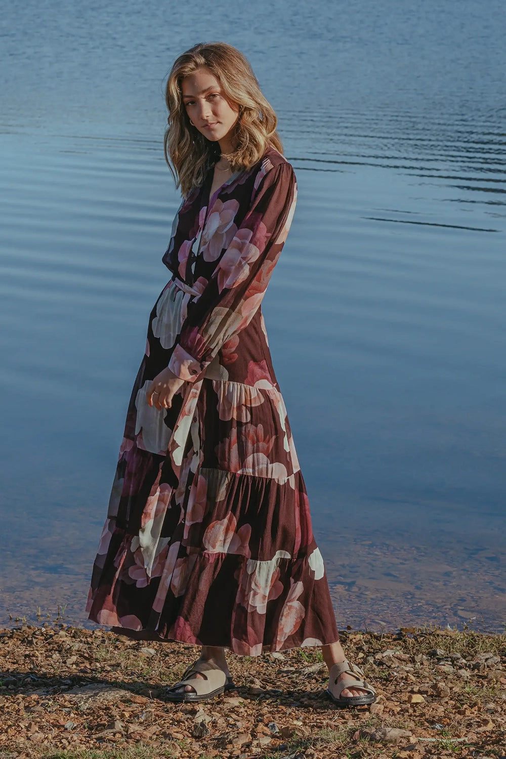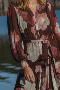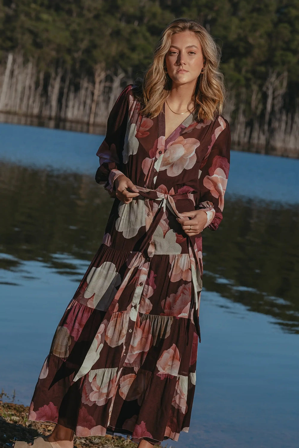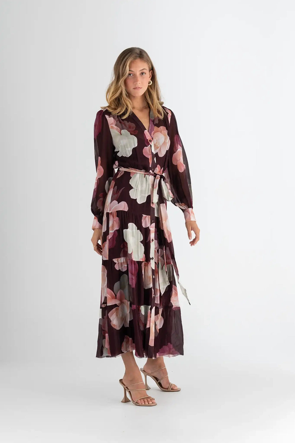 The Memoirs Shirt Midi by PASDUCHAS is crafted from soft viscose chiffon, featuring an exclusive floral print. This classic button-through, tiered shirt midi dress is complete with self-covered buttons along the centre front. It cinches at the waist with a self-tie belt, and the full-length cuffed sleeves bring balance to the look. Fully lined through the body, offering comfortable coverage.