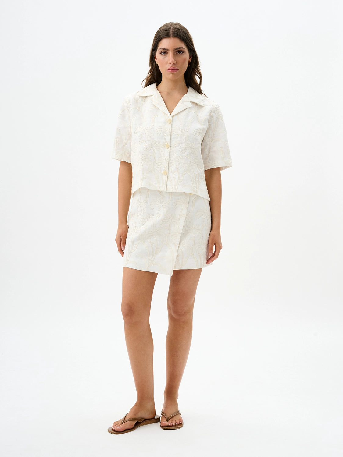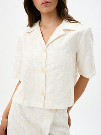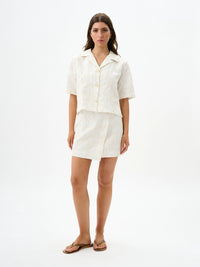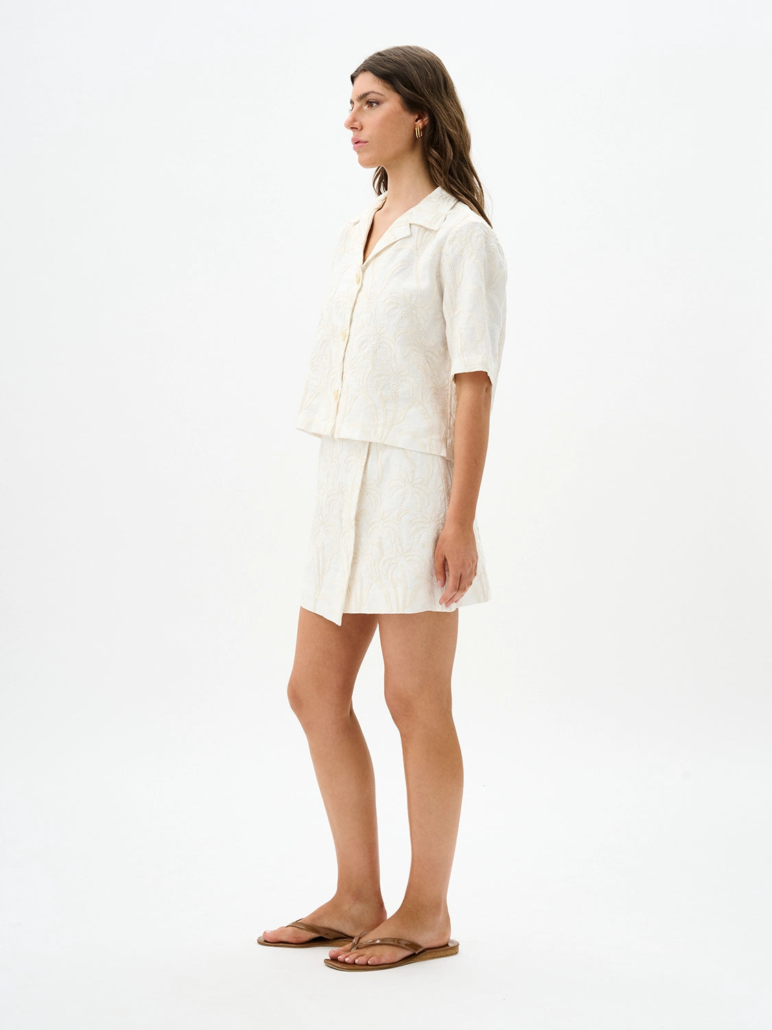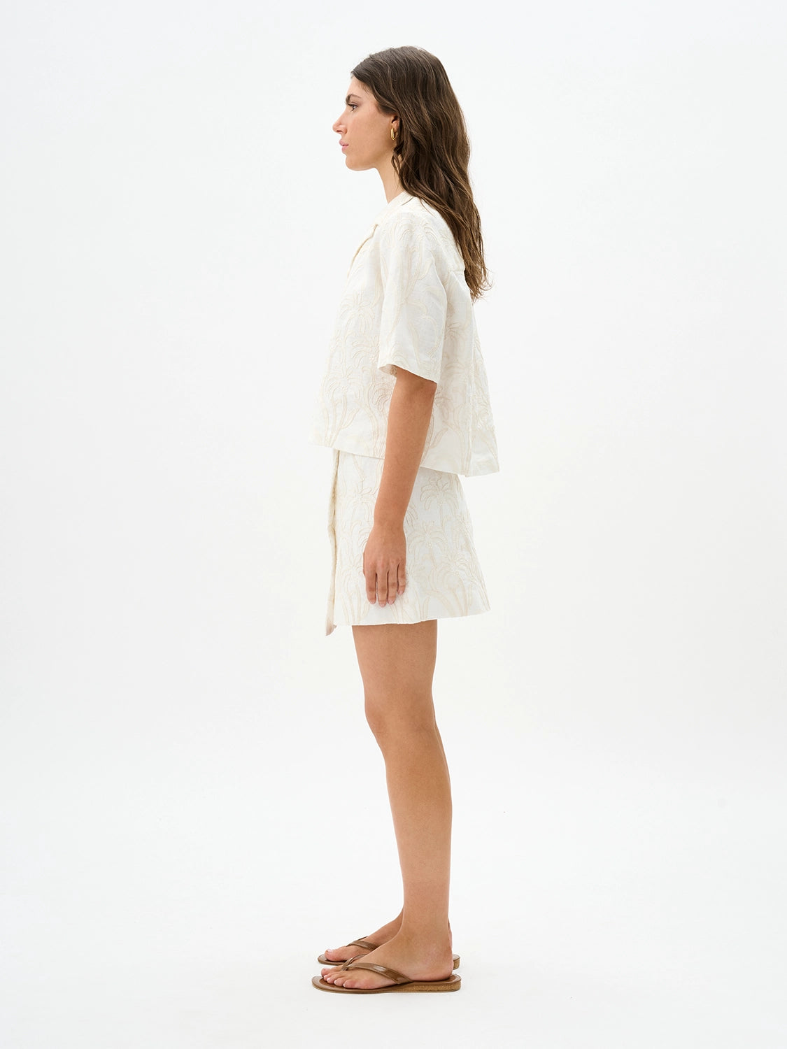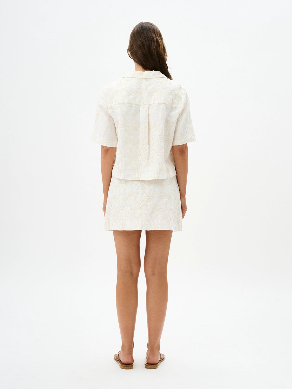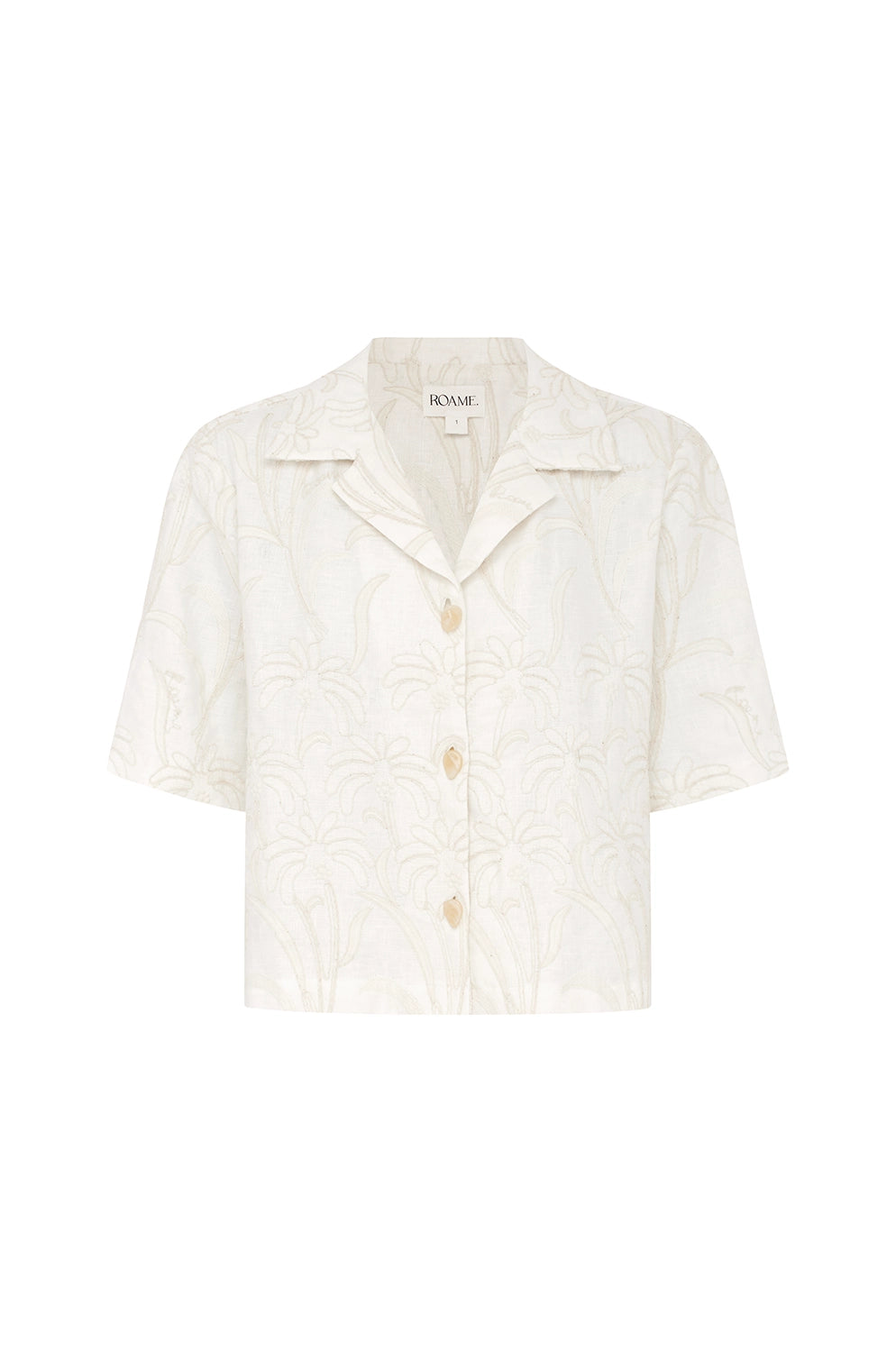 Soak up the sunshine in the Freya Shirt. Designed in a cropped silhouette, this versatile style features a pointed collar, short sleeves, and a centre front button placket. Crafted in ROAME’s exclusive Royal Palm fabrication, it pairs effortlessly with the matching Sadie Skirt for a monochromatic ensemble or with relaxed denim shorts for a casual vibe.