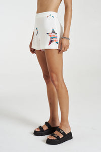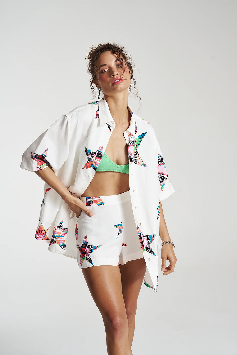 The Sig Fitted Shorts by Summi Summi are designed with a high waist and relaxed leg silhouette, making them both figure-flattering and versatile. Featuring the exclusive 'Star X Lovers' custom print, these shorts are crafted from a linen-rayon blend, offering both comfort and style. Back pockets add functionality to this chic design.