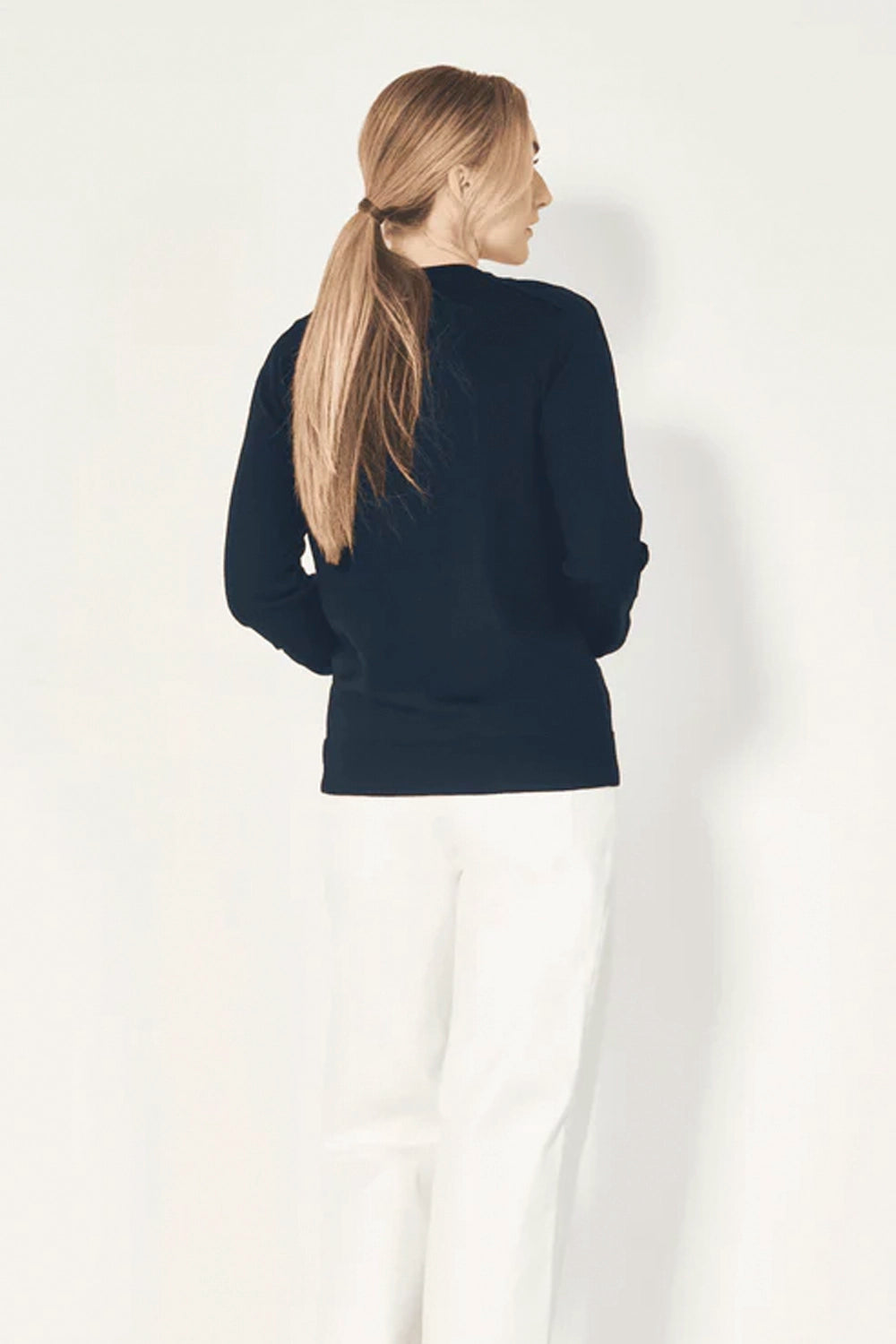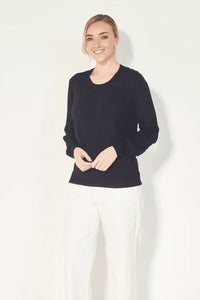 100% Merino sweater ribbed, scoop crewneck. Set in sleeve with seam detail on shoulder and along the arm.  Full length sleeve with deep rib cuff and ruched detail on elbow.  The Cole sweater falls below the hip with ribbed hem.