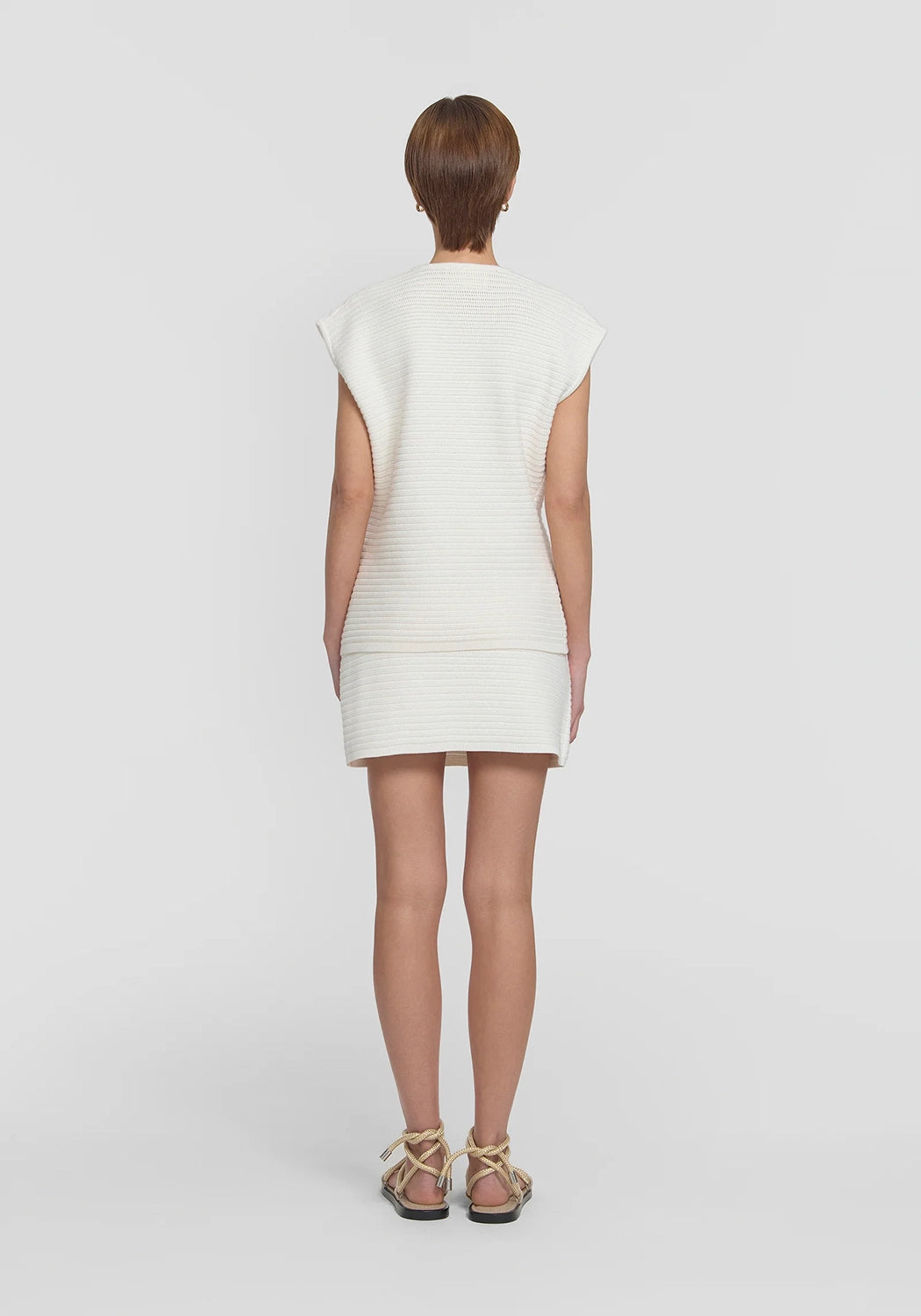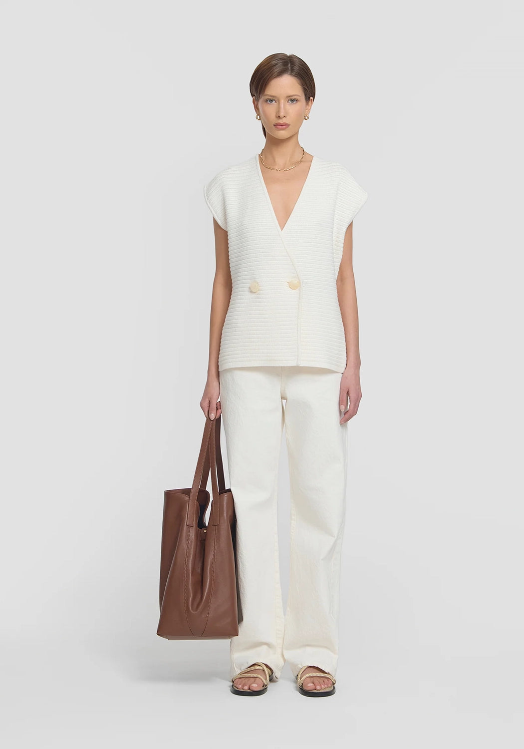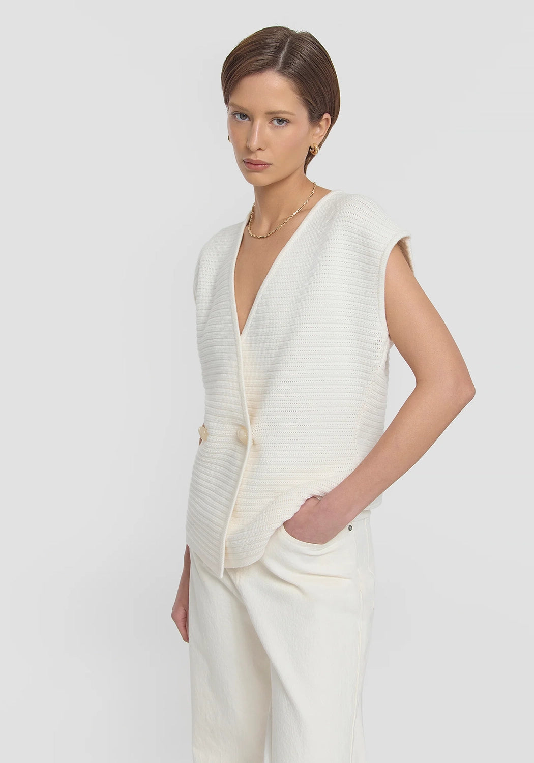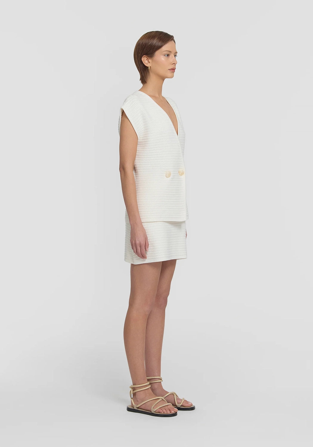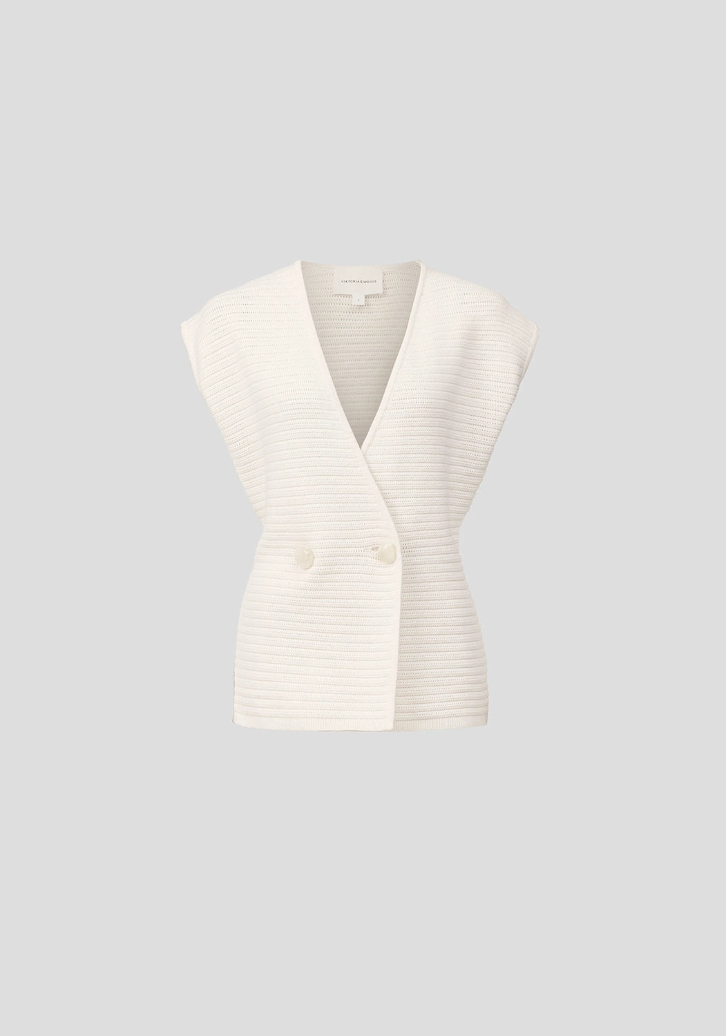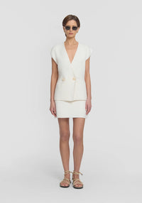 The Anarchy Vest by Viktoria & Woods is a fully fashioned knit vest crafted from a luxurious cotton-silk blend in ivory. It features a double-breasted front, extended shoulder design, and statement ivory resin buttons, all finished with a subtle texture. Pair it with the Riot Mini Skirt for a sophisticated look that seamlessly fuses intricate design with effortless styling.