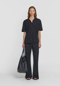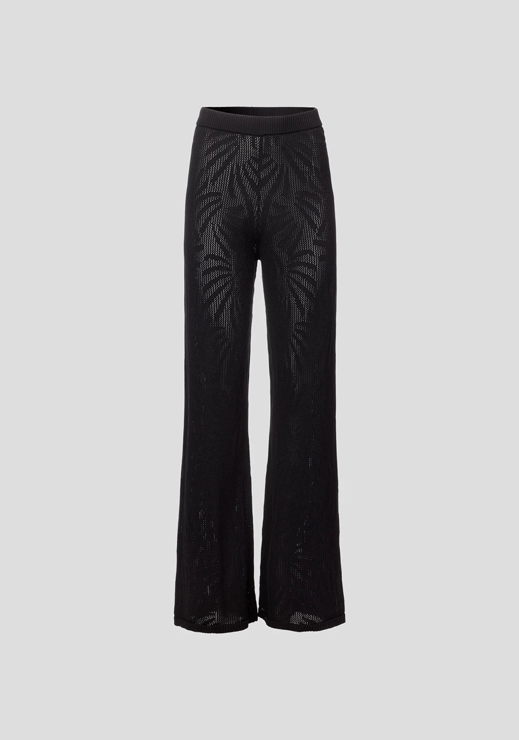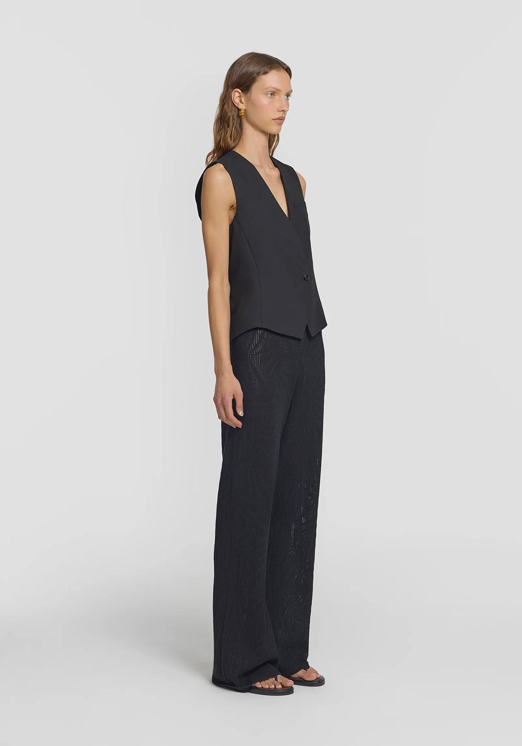 The Spain Pant by Viktoria & Woods embodies relaxed sophistication. Crafted from organic black cotton, these fully fashioned knit pants feature subtle abstract palm leaf motifs, offering a sheer finish that exudes modern elegance. The ribbed waistband ensures comfort, while the flowing palazzo leg profile adds a touch of effortless style. Pair them with the matching Valencia Shirt for a cohesive and refined ensemble.